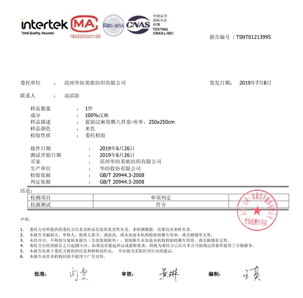 華紡成為全球首家獲得工業大麻產品MADE IN GREEN by OEKO-TEX(以下簡稱MIG)綠色標簽的企業后,開始大力開發帶有MIG標簽工業大麻家紡產品,工業大麻床品具備天然抗菌、吸臭排污的功能,通過測試,對金黃色葡萄球菌抑菌率達97.7%,對大腸桿菌抑菌率達91.4%,白色念珠菌抑菌率達98.2%。