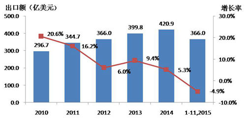 中國海關(guān)最新統(tǒng)計數(shù)據(jù)顯示,2015年1-11月,我國家紡產(chǎn)品累計出口366.1億美元,同比下降4.9%。其中,出口數(shù)量同比下降2.4%,出口價格同比降低2.5%。出口疲軟主要原因是國際市場需求下降以及匯率因素。