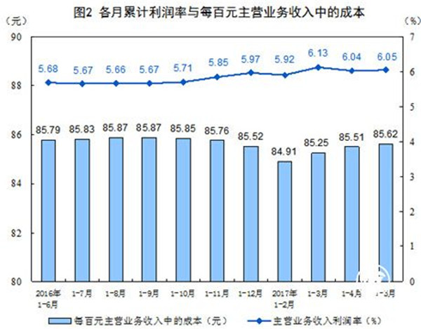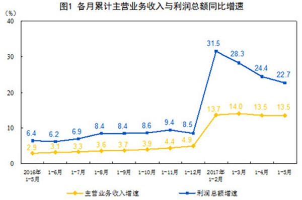 1-5月份,規模以上工業企業實現主營業務收入48萬億元,同比增長13.5%;發生主營業務成本41.1萬億元,增長13.4%;主營業務收入利潤率為6.05%,同比提高0.45個百分點。
