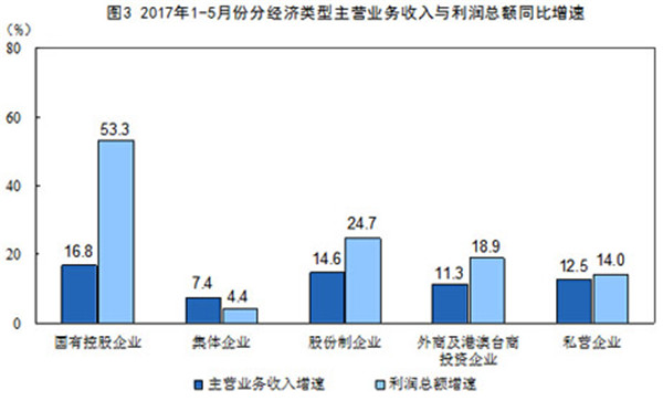 1-5月份,規模以上工業企業中,國有控股企業實現利潤總額6520.4億元,同比增長53.3%;集體企業實現利潤總額179.4億元,增長4.4%;股份制企業實現利潤總額20049.5億元,增長24.7%;外商及港澳臺商投資企業實現利潤總額7112.8億元,增長18.9%;私營企業實現利潤總額9611.3億元,增長14%。