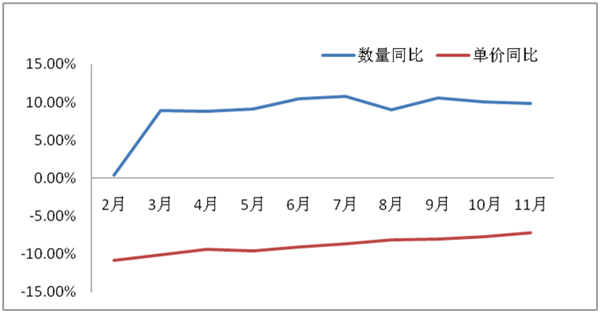 前11個(gè)月,我國(guó)家紡產(chǎn)品出口數(shù)量同比增長(zhǎng)9.81%,出口單價(jià)同比下降7.18%,較前兩年比較,今年以來(lái)呈現(xiàn)出口數(shù)量發(fā)展穩(wěn)定,出口單價(jià)降幅逐漸收窄的趨勢(shì)。