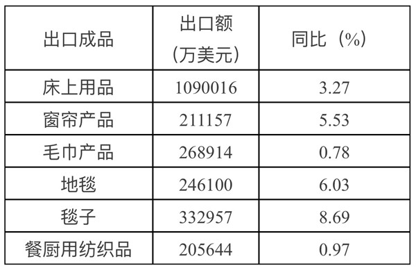 以成品來(lái)看,出口的主要成品出口額均呈現(xiàn)不同程度的上漲,其中床品、窗簾、地毯、毯子出口額同比上漲3.27%、5.53%、6.03%、8.69%,高出去年同期水平8.83、11.04、10.29、16.66個(gè)百分點(diǎn)。毛巾產(chǎn)品出口額與上年基本持平,但增長(zhǎng)緩慢,同比低于上年同期水平12.65個(gè)百分點(diǎn)。(劉丹)