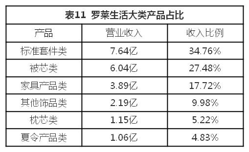 2018年上半年,羅萊生活實現營業收入21.97億元,較去年同期增長10.87%,歸屬于上市公司股東的凈利潤2.18億元,同比增長35.14%,近年來公司兩項指標一直保持高增長(表10)。羅萊生活致力于全品類家居,家具及其他飾品營業收入占比達27.7%(表11)。