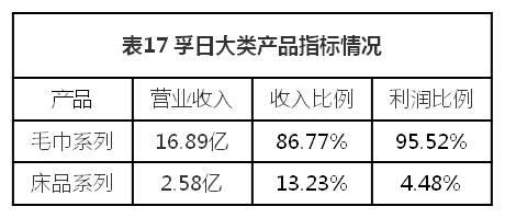 2018年上半年,孚日實現營業收入25.78億元,同比增長9.17%;實現凈利潤1.93億元,主要受匯率影響同比下降20.75%。以歷年數據來看,孚日近三年來營業收入平穩增長(表16)。營業收入中有75.5%由家紡產業貢獻,共計19.46億元,其中毛巾產品占比86.77%(表17)。
