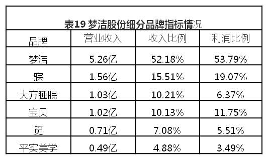 上半年,夢潔實現營業收入10.07億元,同比增長28.22%;歸屬上市公司股東的凈利潤0.92億元,同比增長31.07%(表18)。公司實施多品牌戰略,以"夢潔"為主,營收占到一半以上,在其他品牌中,"寐"、"寶貝"利潤貢獻較大(表19)。