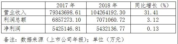 2018年滬深兩市166家紡織服裝類上市公司共實現營業收入(以下簡稱“營收”)10426.42億元,比上年度增長31.41%。實現凈利潤543.21億元,較之2017年(542.51億元)同比增長0.13%。其中:97家(占比58.4%)實現凈利潤同比增長,最高增幅約達3079.8%。2017-2018年營業收入、利潤總額、凈利潤及同比增長情況如下表2: