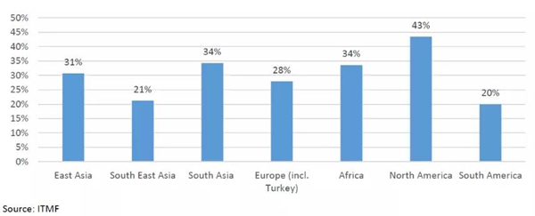 談到地區(qū)差異,北美43%的企業(yè)沒(méi)有收到取消/延期的警告,而南美和東南亞的這一比例分別只有20%和21%(見(jiàn)下圖)。