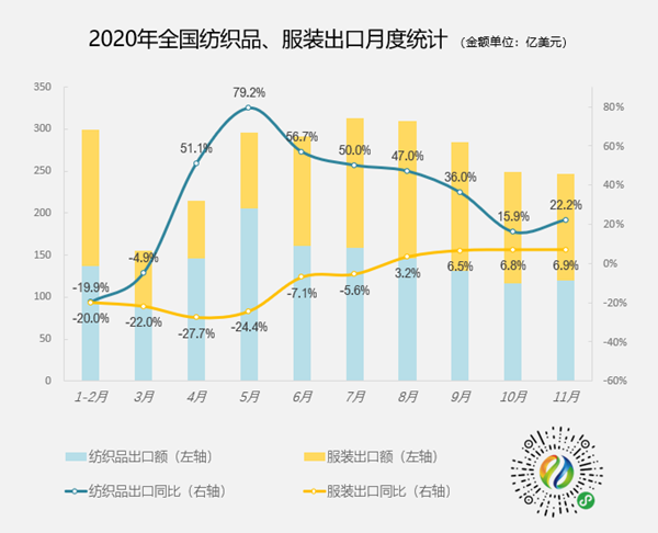 據海關總署統計快訊數據,今年1-11月,全國紡織品服裝出口2652.2億美元,同比增長9.9%(以人民幣計同比增長11.4%)。其中紡織品出口1416.5億美元,同比增長31.0%(以人民幣計同比增長33.0%),服裝出口1235.7億美元,同比下降7.2%(以人民幣計同比下降6.2%)。