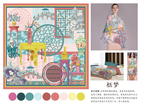 設計說明:世界因為絲綢而知道中國,絲綢孕育了中國時尚的成長也蘊藏著有關中國與世界的故事。在當代,中國人對傳統文化情有獨鐘,同時中國傳統文化正潛移默化的影響著我們的生活。我的作品以明清時期的建筑、家具為靈感來源。運用了抽象、插畫的表現形式,傳統的元素加以大膽的色彩運用來貼合當代時尚。意在希望中國傳統文化能在現代設計在設計中更為廣泛、深入的應用。可用于數碼印、絲網印等工藝。