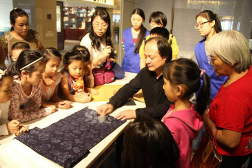 講座現(xiàn)場還推出"雕龍刻鳳--體會藍(lán)印花布刻版魅力"、"板上五彩---感受藍(lán)印花布上漿工序"、"藍(lán)色世界---剪紙"三項(xiàng)手工體驗(yàn)。
