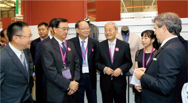 中國紡織工業聯合會名譽會長杜鈺洲(右三)、副會長兼秘書長高勇(右四),副會長徐文英(左二)等領導與參展企業親切交流