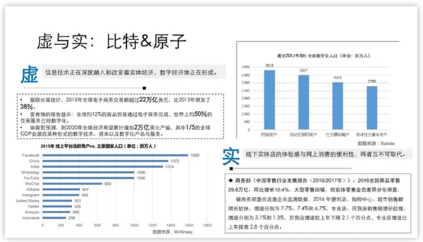 虛與實,虛表現(xiàn)在信息技術(shù)正在深度融入和改變著實體經(jīng)濟,數(shù)字經(jīng)濟體正在形成;實表現(xiàn)在線下實體店的體驗感正在與網(wǎng)絡(luò)營銷無縫融合。