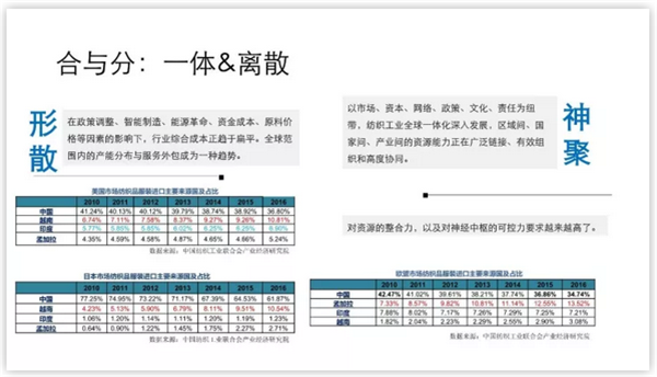 合與分,一方面,行業(yè)綜合成本正在趨于扁平化,全球范圍內(nèi)的產(chǎn)能分布與服務(wù)外包成為一種趨勢;另一方面,資本、網(wǎng)絡(luò)、文化等正在推動紡織全球一體化深入發(fā)展,區(qū)域間、國家間、產(chǎn)業(yè)間的資源能力正在廣泛鏈接和高度協(xié)同。