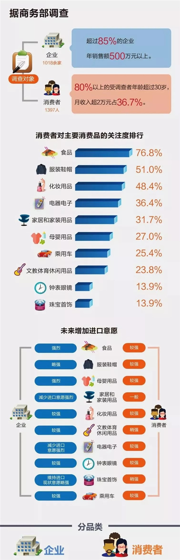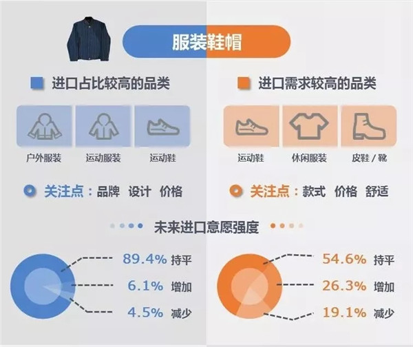 近日,商務部發布《主要消費品供需狀況統計調查分析報告》。調查顯示,消費者對服裝鞋帽關注度極高,未來增加進口意愿較強,尤其是運動鞋、休閑服裝、皮鞋進口需求較高。