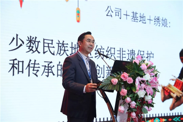 中央民族干部學院民族干部教育研究中心主任劉寶明以“公司+基地+繡娘”為主題作發言時表示,隨著時代的變遷,少數民族刺繡印染等傳統技藝日益受到嚴峻挑戰,一些技藝正在加速消失.實踐證明,要想實現民族地區紡織非遺的持久性傳承保護,首先要解決好非遺傳人的生計問題,保證非遺傳人在傳承中能夠獲得起碼的經濟收益,以提高其傳承非遺的積極性,通過增強非遺傳承活動的經濟驅動力,增強非遺保護和創新的力度。“非遺傳人+公司+基地+繡娘”,這是民族地區非遺傳承的一種新模式,這種模式它是一能夠適應現代社會特別是現代市場經濟發展要求的一種模式。