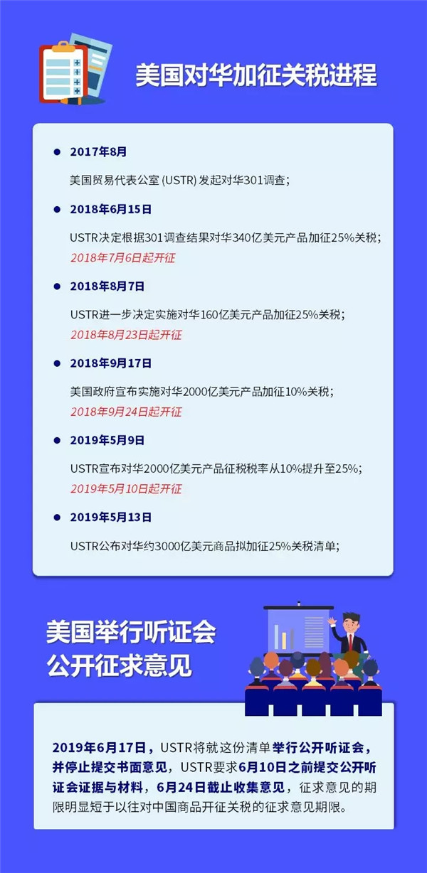 2019年5月13日,美國貿易代表辦公室(USTR)公布對約3250億美元中國商品擬加征25%關稅清單(簡稱清單4),涉及我國紡織行業對美出口比重較大的服裝(HS61、62章)和大部分家用紡織品(HS63、94章)以及部分紡織機械產品(HS84章),涉及我行業對美年出口金額超過400億美元產品。目前美國正在就該清單征求公眾意見,并將于6月17日舉行公開聽證會。對于是否正式針對該3000億美元中國商品清單加征25%關稅,還將在公開聽證會征求意見后,結合中美貿易談判的最新進展情況而定。