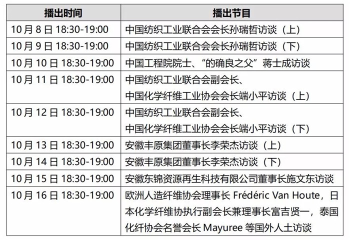 為向全球展現(xiàn)70年來中國化纖行業(yè)產(chǎn)生的巨大變化,中國紡織工業(yè)聯(lián)合會、中國化學纖維工業(yè)協(xié)會、中國紡織工業(yè)聯(lián)合會傳媒中心與中央廣播電視總臺央廣經(jīng)濟之聲《愛評論:新時代百人對話錄》欄目攜手,即將推出紡織行業(yè)系列人物特別訪談節(jié)目《編織奇跡的中國紡織業(yè)》。