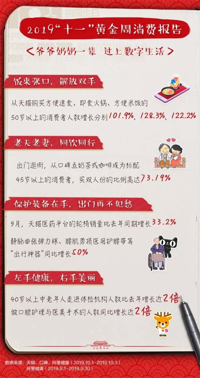 隨著智能手機和移動支付的普及,中老年群體逐漸成為數(shù)字化消費的生力軍。從阿里巴巴公布的黃金周消費數(shù)據(jù)看,“銀發(fā)一族”不但點外賣、懂網(wǎng)購、愛旅游,也愿意在中高端體檢和醫(yī)療美容上花錢。黃金周長假的最后一天是重陽節(jié),很多人也提前給父母準(zhǔn)備禮物、安排活動,表達(dá)孝心。