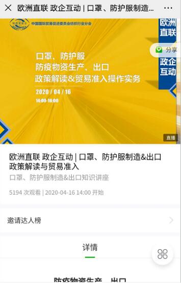 為幫助行業企業及時掌握出口、認證新政,減少企業經濟損失和法律風險,4月16日下午,中國國際貿易促進委員會紡織行業分會組織召開了一場名為“口罩、防護服防疫物資生產、出口政策解讀&貿易準入操作實務”的在線直播講座,邀請來自上海市市場監督管理局認證監督處、上海勞保用品協會、英柏檢測技術有限公司及西班牙紡織行業研究會的專家從不同維度為行業企業解讀相關政策、操作流程及注意事項。