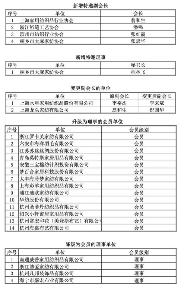會上,還進行了中國家用紡織品行業(yè)協(xié)會六屆三次理事會理事單位調(diào)整及選舉(名單見文尾)。會上還宣布,2018-2019年床品、布藝、毛巾專委會執(zhí)行主任將分別由堂皇集團董事長