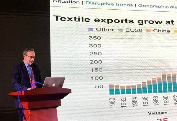 中國紡織工業聯合會國貿辦主任林云峰對“一帶一路”沿線重點國家和地區紡織服裝業投資合作情況進行了分析。他指出,近年來我國紡織行業進入全球布局階段,骨干企業主動進行國際布局的意識不斷提高。2018年,紡織行業全年對外直接投資總額達9.82億美元。